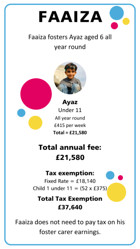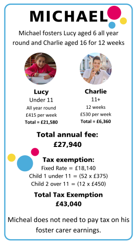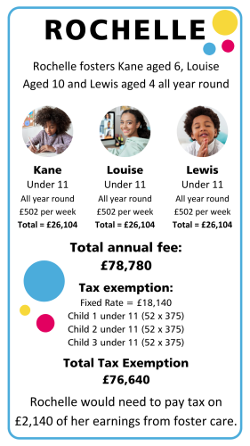 Example: Rochelle is a carer for an 8 year old all year round and a 16 year old for 12 weeks of the year. She does not have to pay tax on the first £43,040 she earns from fostering: