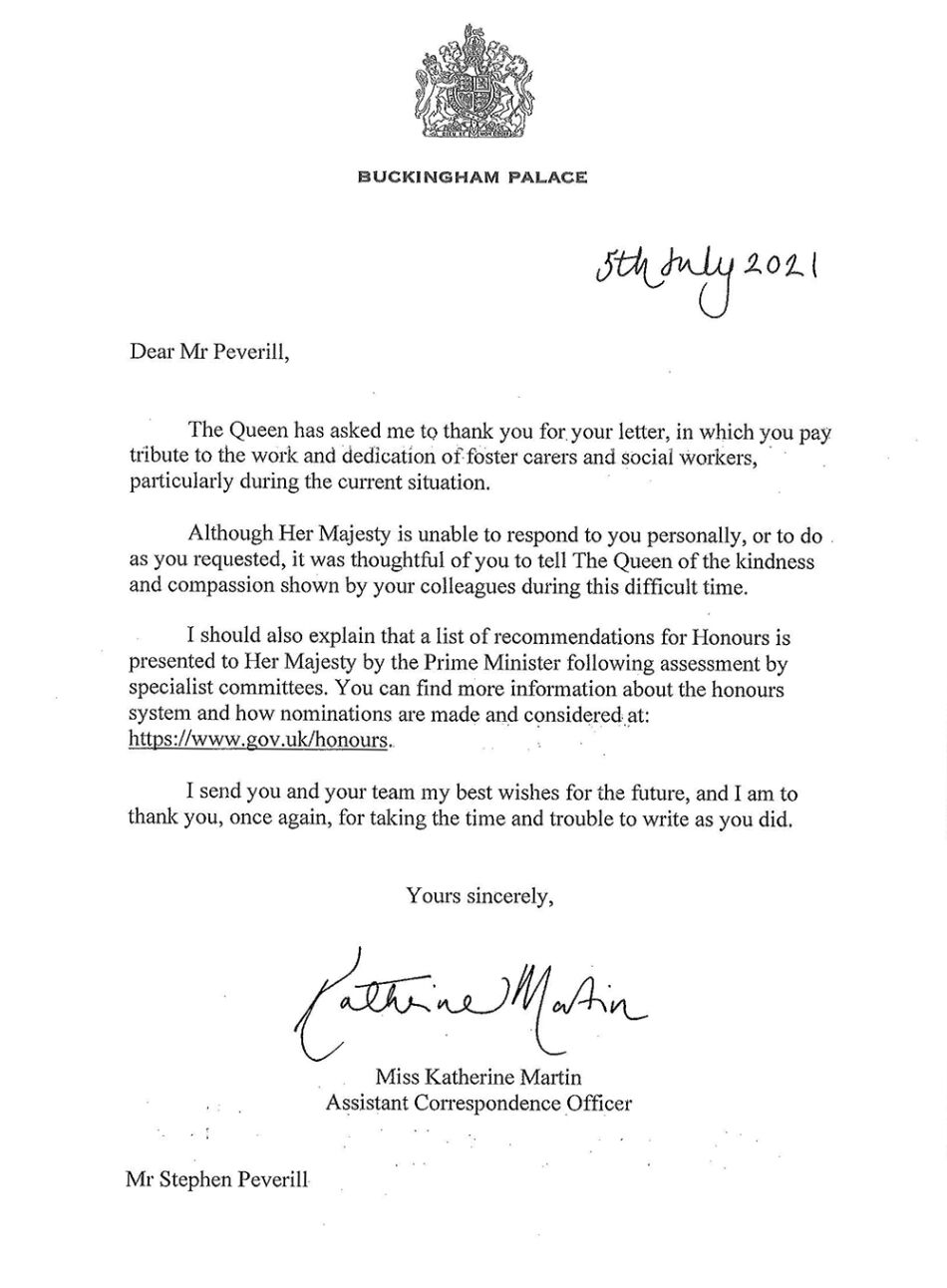 We’re always trying to shine a light on the great work our foster carers and social workers do, despite not always being recognised as frontline staff. Steve Peverill our team manager recently wrote to the Queen to highlight the hard work you do and the compassion you show towards children and young people, especially during these challenging times.
